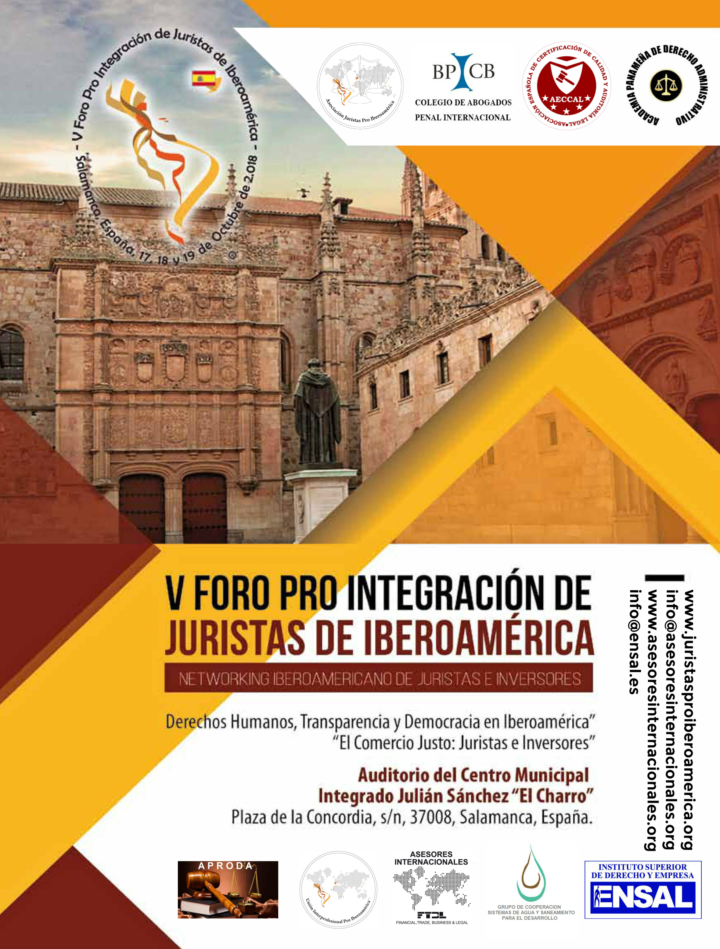 El V Foro Pro Integración de Juristas de Iberoamérica, se celebrará en Salamanca del 17 al 19 de Octubre, propiciando, además, la celebración de un “Networking Iberoamericano de Juristas e Inversores”, con la finalidad de intercambiar ideas, y de construir posibles redes de contactos que nos ayuden a generar oportunidades tanto de negocio, como culturales y profesionales.