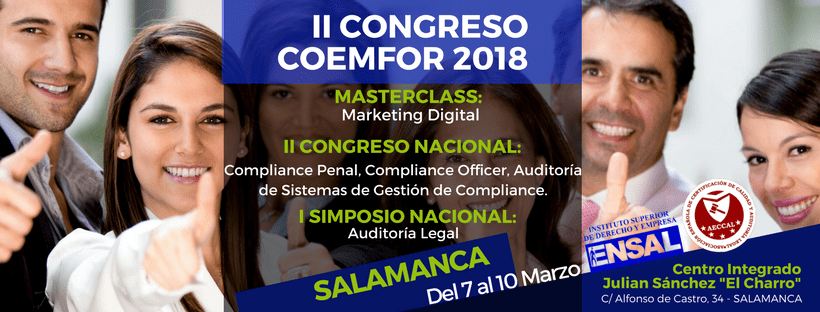 II CONGRESO COEMFOR 2018 El II Congreso COEMFOR 2018, se celebrara del 7 al 10 de Marzo del 2018, en el Centro Municipal Integrado Julian Sánchez El Charro de Salamanca. COEMFOR 2018 es un Congreso Profesional organizado por AECCAL (Asociación Española de Certificación de Calidad y Auditoria Legal) destinado a Juristas, Economistas, Peritos Mercantiles, Graduados …
